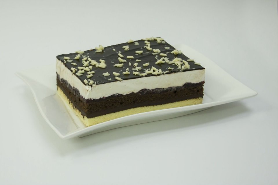Pyszne warstwy biszkoptów: czekoladowego i jasnego, na podłożu żelka z owocami leśnymi na której trzyma się sztywno delikatna masa z bitej śmietany, całość wykończona żelem czekoladowym posypanym wiórkami z białej czekolady.