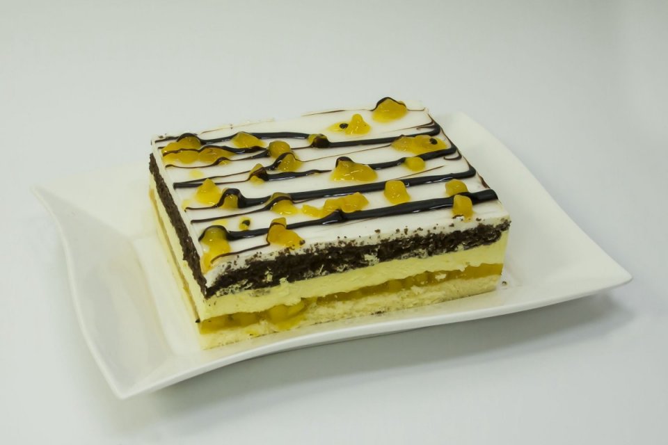Wyrazisty ciemny biszkopt pod warstwą żelki z mango i marakuji, przykryta puszystą śmietaną. Górna jasna część biszkoptu pokryta delikatną śmietaną z żelem neutralnym ozdobiona kawałkami owoców mango.